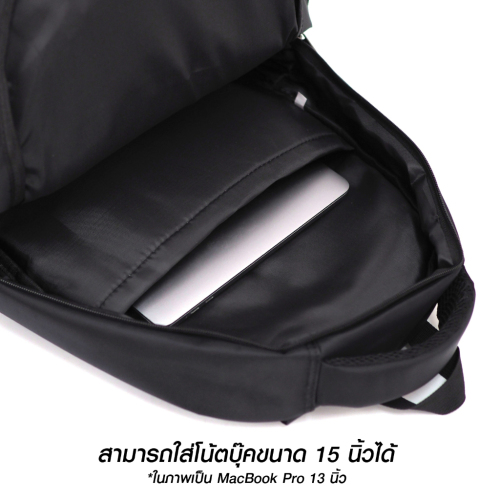 - ช่องซิปหลัก ด้านในมีช่องบุกันกระแทกสำหรับใส่ Notebook ขนาด 15 นิ้ว (กว้าง 27 ซม., ลึก 30 ซม.)