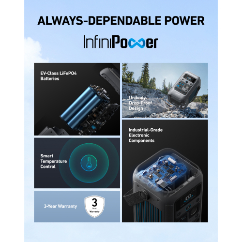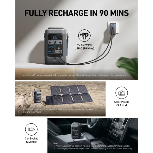 ● พอร์ตชาร์จ 7 ประเภทสำหรับอุปกรณ์: ชาร์จอุปกรณ์ได้หลากหลายด้วยพอร์ตครบครัน ได้แก่ 1× ช่องสตาร์ทรถ (120W), 2× USB-C (140W), 1× USB-C (100W), 1× USB-C (15W), และ 2× USB-A (12W)