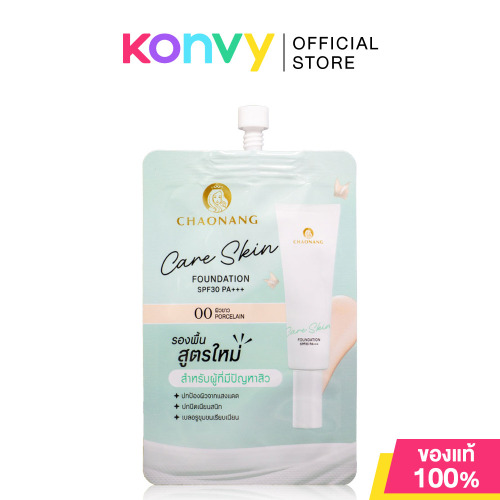 Chaonang Care Skin Foundation SPF30 PA+++ 5g #00 Porcelain รองพื้นสูตรน้ำ เนื้อบางเบาสบายผิว เกลี่ยง่าย ควบคุมความมัน ติดทนนาน ด้วยเทคโนโลยี Ultra Smooth Film และ Treated Pigment ช่วยเบลอผิว และปรับผิวให้แลดูกระจ่างใส ผสานสารสกัดจากธรรมชาติ อันได้แก่ Edelweiss Extract, Chamomile Extract และ Aloe Vera Extract ช่วยปลอบประโลมและเติมความชุ่มชื้นให้ผิว พร้อมดูแลผิวที่มีปัญหาสิว เผยผิวเรียบเนียน เป็นธรรมชาติ ดูสุขภาพดี