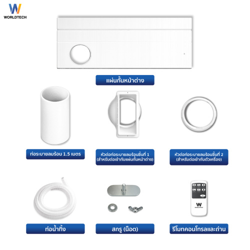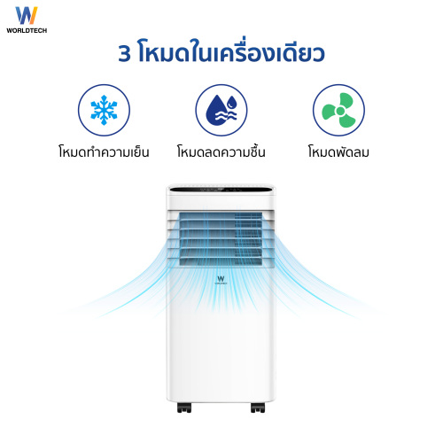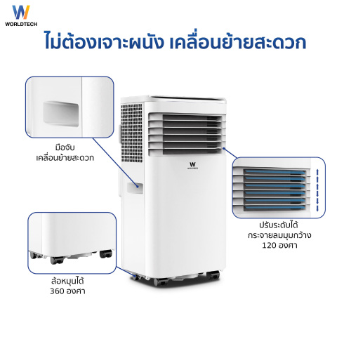 - Worldtech แอร์เคลื่อนที่ 9000 BTU รุ่น WT-SKY-1A-09 หน้าจอ LED พร้อมรีโมทควบคุม ทำงานเงียบ