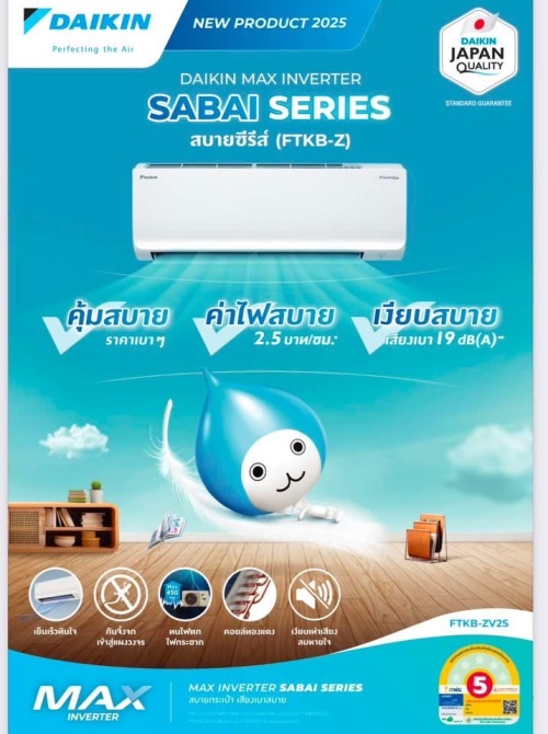 FTKB15ZV2S ขนาด 15,000 บีทียู ค่าSEER 18.20 ค่าไฟฟ้า 12,167 บาท ต่อปี ใช้กับห้องไม่เกิน 25 ตร.ม.